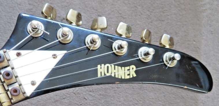 There are a number of Japanese-made Hohners with this logo, usually Telecaster or Stratocaster copies. These could possibly be from the first half of the 1970s. If they are, these would be the earliest examples of what is sometimes called the ‘teacup handle’ logo. This always has a scroll on the first H and, depending on the headstock shape, an extension or scroll on the R. Later examples were usually a solid colour (or inlay on expensive guitars), but these examples are always gold with a black border.